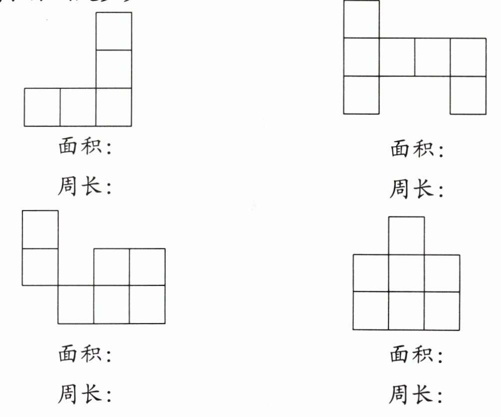 三、下面各图形是用面积为1平方厘米的正方形拼成的。它们的面积和周长分别是多少?
