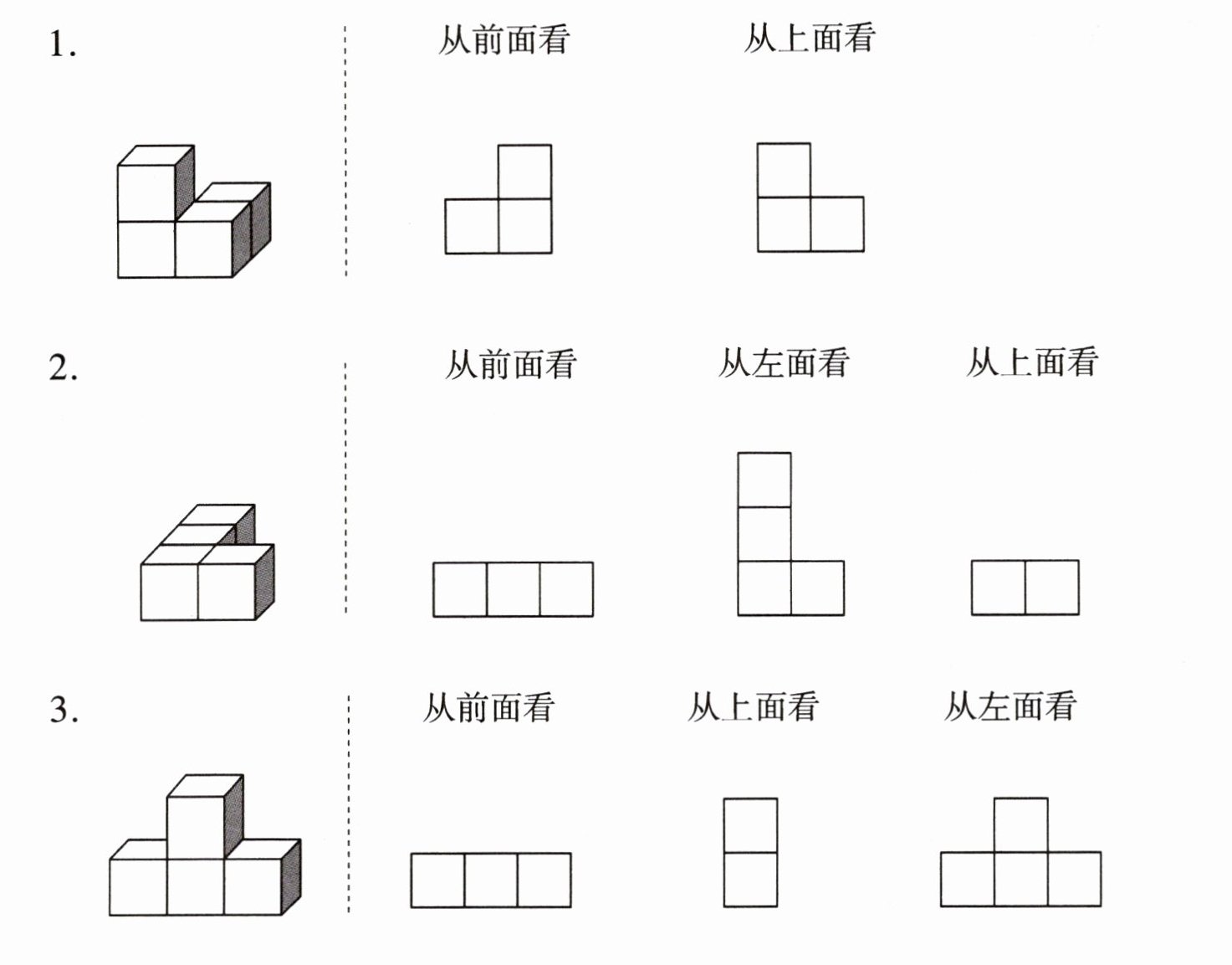 2. 从前面看连右边第一个图形,从左面看连右边第二个图形,从上面看连右边第三个图形。