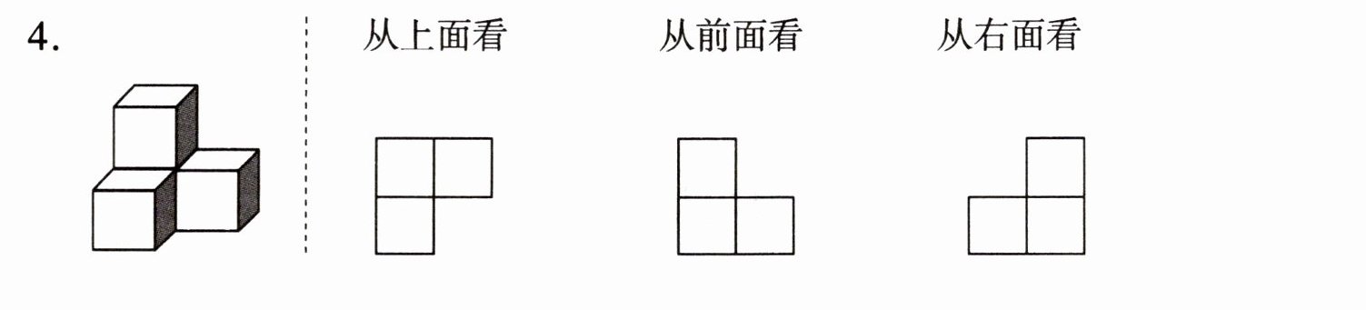 4. 从上面看连右边第一个图形,从前面看连右边第二个图形,从右面看连右边第三个图形。
