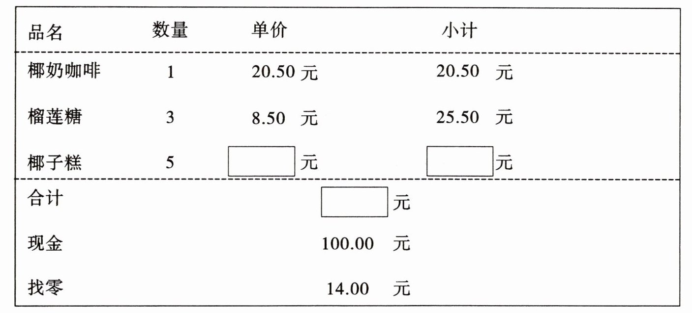 五、下面是小林到海南旅游时的一张购物小票,请你补充完整。
