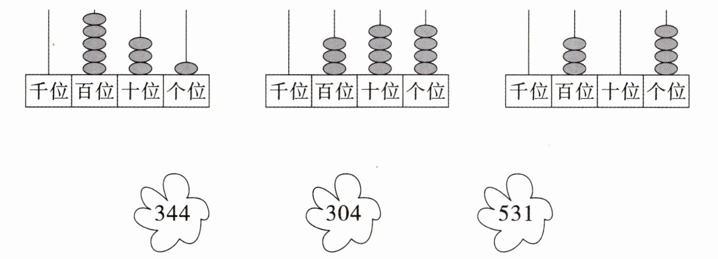 第二个算盘:百位$3$个珠子表示$3$个百,十位$4$个珠子表示$4$个十,个位$4$个珠子表示$4$个一,这个数是$344$。