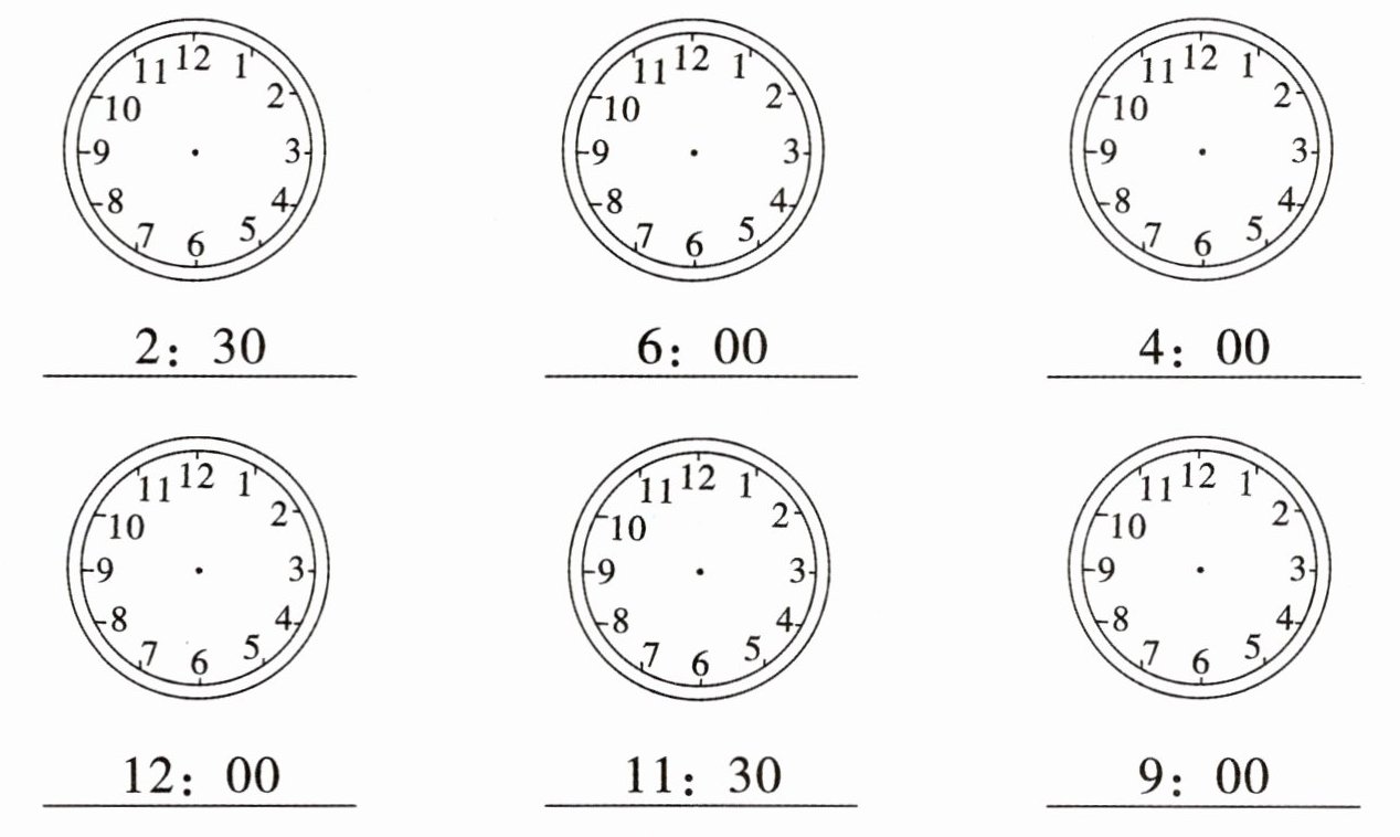 【解析】:画时针和分针时,先看时针,再看分针。整时的时候,分针指向$12$,时针指向几就是几时;几时半的时候,分针指向$6$,时针在两个数字中间,走过数字几就是几时半。