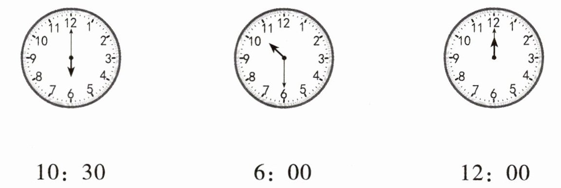【解析】:第一个钟表时针指向$6$,分针指向$12$,表示$6:00$;第二个钟表时针在$10$和$11$之间,分针指向$6$,表示$10:30$;第三个钟表时针和分针都指向$12$,表示$12:00$。