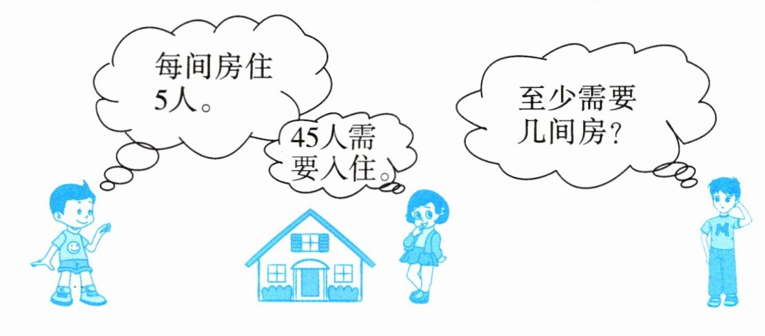 【解析】:已知总人数是$45$人,每间房住$5$人,求至少需要几间房,就是求$45$里有几个$5$,用除法计算,即$45\div5 = 9$(间)。