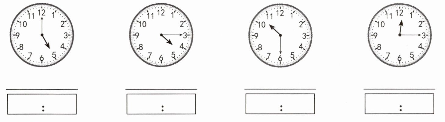 第一个钟表时针在4和5之间,分针指向9(45分),表示4:45;
