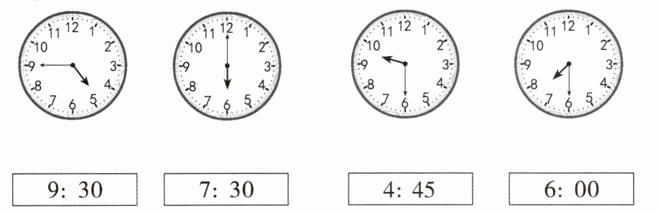 第三个钟表时针在9和10之间,分针指向6(30分),表示9:30;