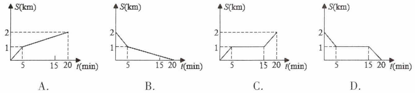 5. 学校离小林家距离为2千米,某天他放学后骑自行车回家,骑行了5分钟后,因故停留10分钟,然后又骑行了5分钟到家,在下列图形中能大致描述他回家过程中离家的距离$s$(千米)与所用时间$t$(分)之间函数关系的是(