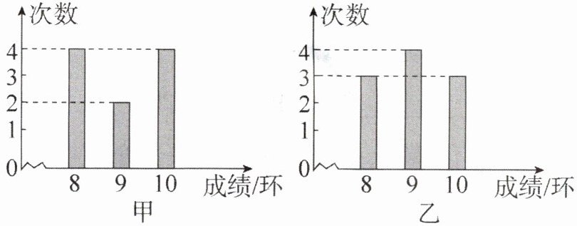 7. 下面是甲、乙两人10次射击成绩(环数)的条形统计图,下列说法正确的是(