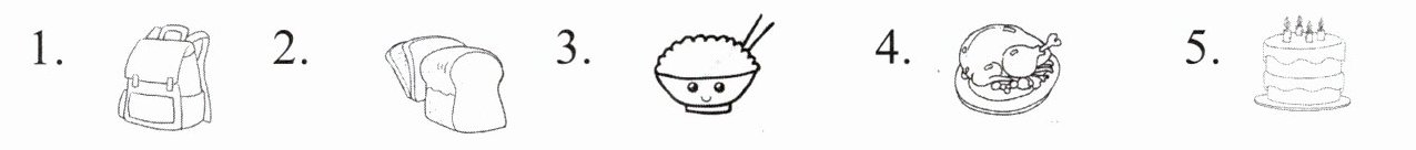1. bag 2. bread 3. rice 4. chicken 5. cake