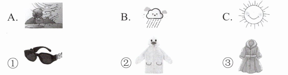 根据天气预报,将图片序号填入表格中相应位置,并在横线上写出合适的单词。