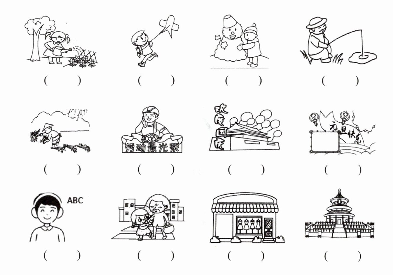 | E. cut rice | F. go fishing | G. New Year’s Day | H. National Day |