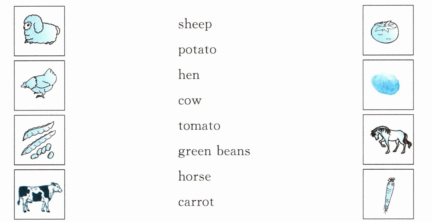 第一列第一幅图连“sheep”;第一列第二幅图连“hen”;第一列第三幅图连“green beans”;第一列第四幅图连“cow”;第二列第一幅图连“tomato”;第二列第三幅图连“horse”;第二列第四幅图连“carrot”(第二列第二幅图没有完全匹配的给定单词,可能是题目设置问题)。