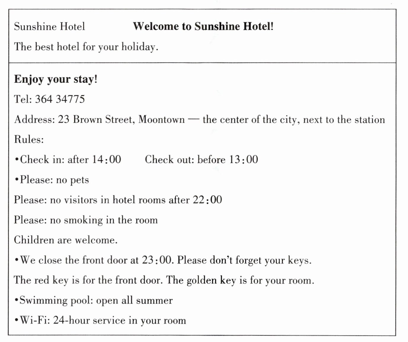 )1. The sign tells the following information about the hotel EXCEPT ______.A. the address