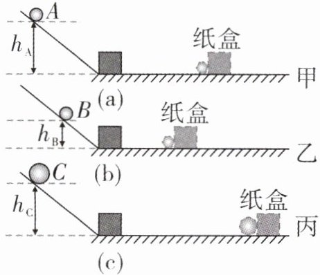 11 在探究物体动能大小与哪些因素有关的实验中,将A、B、C三小球先后从同一装置的$ h _ { A } $、$ h _ { B } $、$ h _ { C } $高处由静止滚下($ m _ { A } = m _ { B } < m _ { C } $,$ h _ { A } = h _ { C } > h _ { B } $),推动纸盒运动一段距离后静止。