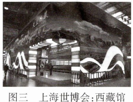 材料二 上海世博会西藏馆(图三)围绕“城市,让生活更美好”这一主题,以新西藏、新发展、新生活、新变化为展示主线,以“保护生态环境、传承民族文化、创造美满生活、促进可持续发展”为展示理念,以“天上西藏”为展示主题,突出表现拉萨城市传统与现代相融合、人与自然相和谐的发展理念和未来构想。