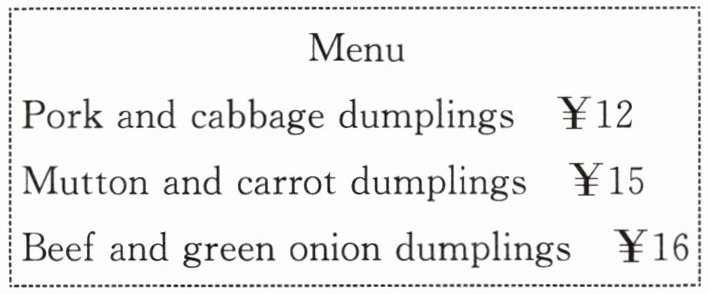 —OK. I'd like a large plate of dumplings. Pork and cabbage dumplings,please.