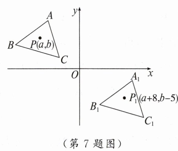7. 如图,在平面直角坐标系中,将三角形$ABC平移至三角形A_1B_1C_1$,点$P(a,b)是三角形ABC$内一点,经平移后得到三角形$A_1B_1C_1内对应点P_1(a + 8,b - 5)$.若点$A_1的坐标为(5,-1)$,则点$A$的坐标为