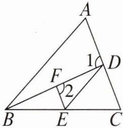 19. 如图,已知$\angle ABC= \angle DEC$,$\angle A= \angle DEF$,试判断$\angle 1与\angle 2$的关系,并说明理由.