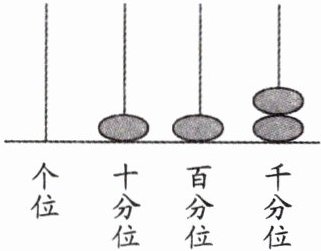 【解析】:根据计数器可知,千分位上有$2$颗珠子,表示$0.002$;百分位上有$1$颗珠子,表示$0.01$;十分位上有$1$颗珠子,表示$0.1$,这个数写作$0.112$,读作零点一一二。