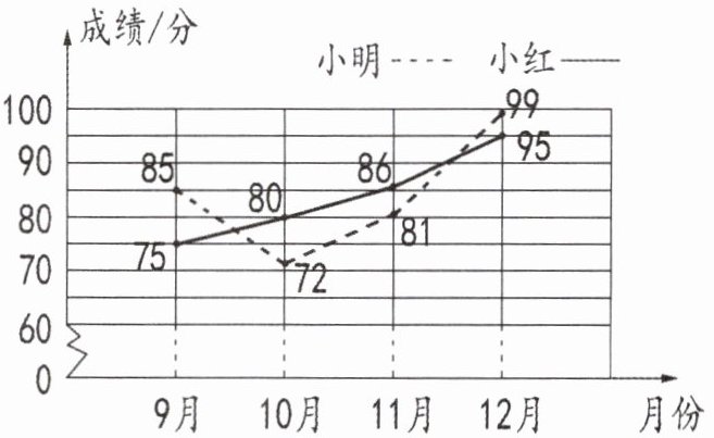 4. 12月份,小红的成绩是小明的$\frac{()}{()}$。