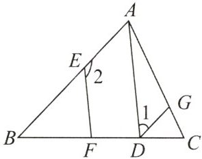 再根据“内错角相等,两直线平行”,由$\angle 1=\angle BAD$,可以推出$AB// DG$。