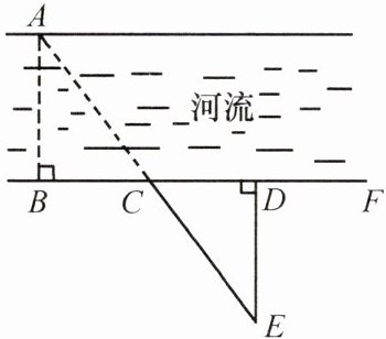 3. 如图,要测量河两岸相对的A,B两点间的距离,可以在AB的垂线BF上取两点C,D,使$BC= CD$,再作出BF的垂线DE,使A,C,E在一条直线上,这时测量的DE的长就是AB的长. 为什么?