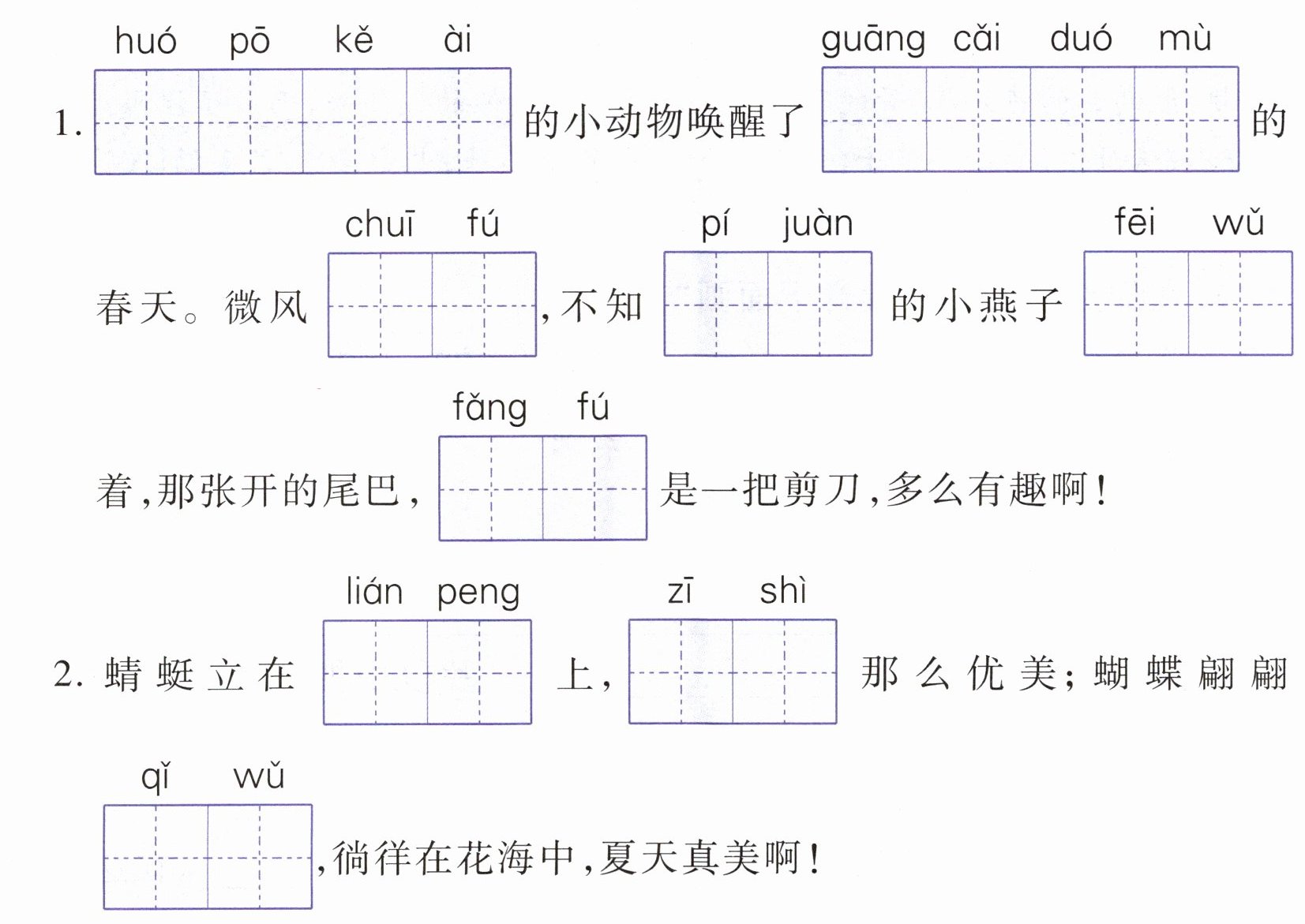 1. 活泼可爱 光彩夺目 吹拂 疲倦 飞舞 仿佛