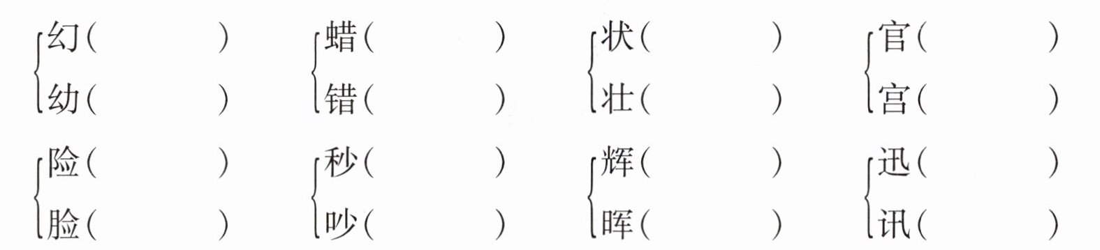 $\left\{\begin{array}{l}\text{幻想}\\ \text{幼小}\end{array}\right.$ $\left\{\begin{array}{l}\text{蜡烛}\\ \text{错误}\end{array}\right.$ $\left\{\begin{array}{l}\text{形状}\\ \text{强壮}\end{array}\right.$ $\left\{\begin{array}{l}\text{官员}\\ \text{宫殿}\end{array}\right.$ $\left\{\begin{array}{l}\text{危险}\\ \text{脸色}\end{array}\right.$ $\left\{\begin{array}{l}\text{秒表}\\ \text{吵架}\end{array}\right.$ $\left\{\begin{array}{l}\text{光辉}\\ \text{余晖}\end{array}\right.$ $\left\{\begin{array}{l}\text{迅速}\\ \text{问讯}\end{array}\right.$