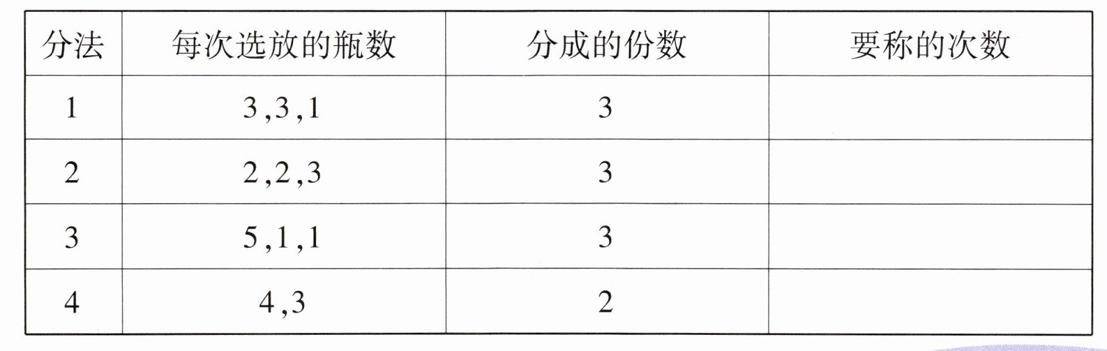 6. 有7瓶药水,其中1瓶稍微轻些,用天平找出这瓶药水,都有哪些称法,请填写下表,并回答问题。