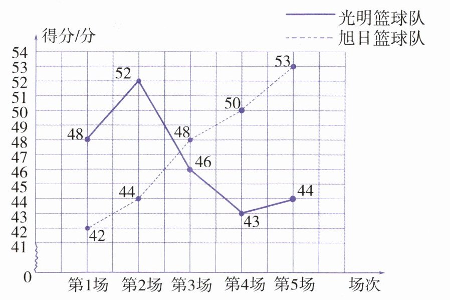 三、下面是光明篮球队和旭日篮球队的五场比赛得分情况统计图。