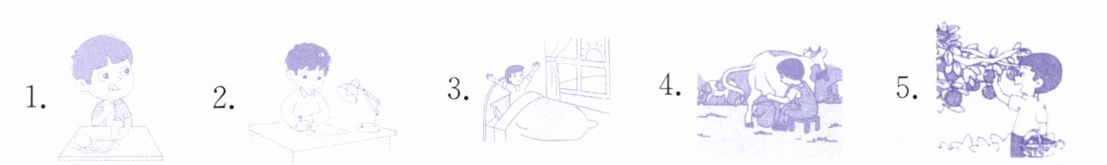 My name is Jason. I live on a farm with my family. I get up at seven o'clock. I have breakfast at half past seven. It's eight o'clock. I help my family on the farm. I feed (喂) the ducks, pigs and cows (奶牛). It's half past eight. I go to school. After school, I go home. It's six o'clock. I pick (摘) apples and tomatoes. I like tomatoes. They are yummy. It's seven o'clock. I have dinner. I do my homework at half past seven.