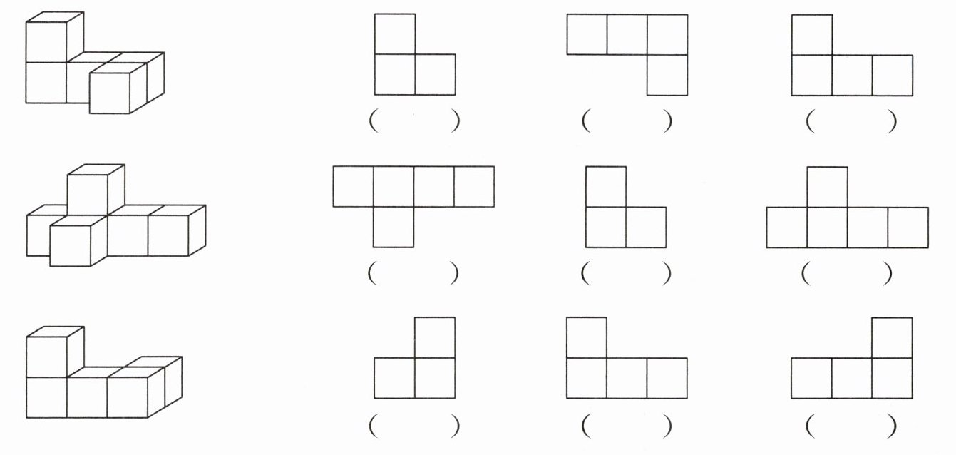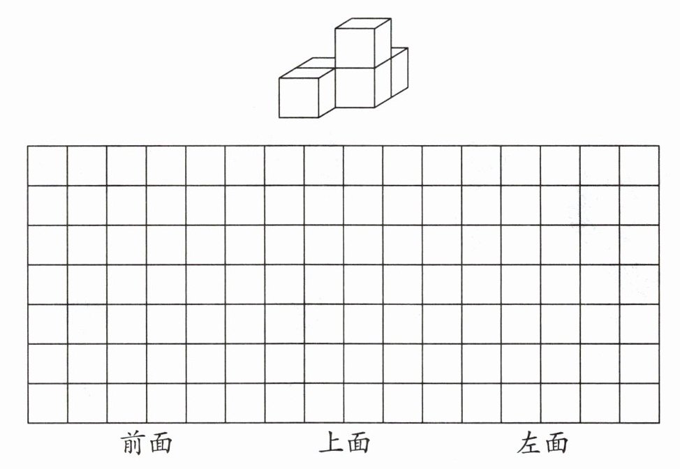 5. 下面是一个由相同正方体搭成的立体,在方格纸上分别画出从前面、上面和左面观察到的图形。