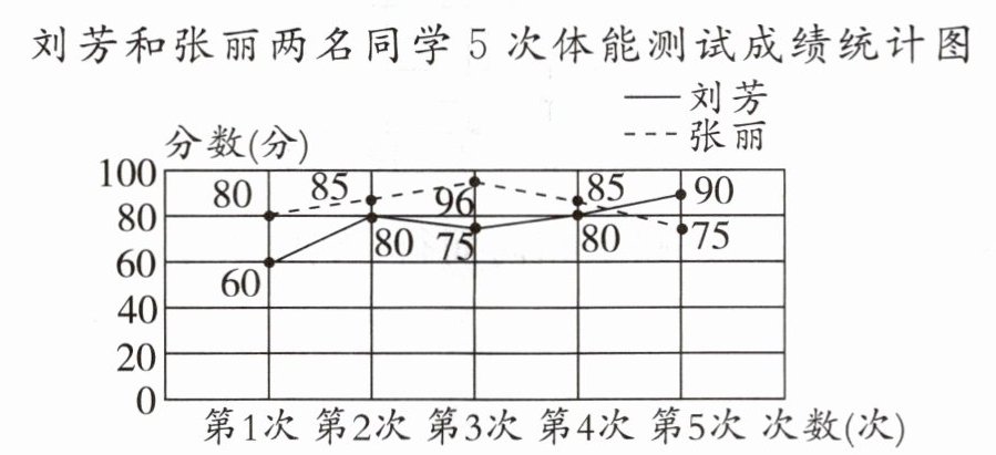 1. 下面是刘芳和张丽两名同学 5 次体能测试成绩统计图,请看图回答问题。