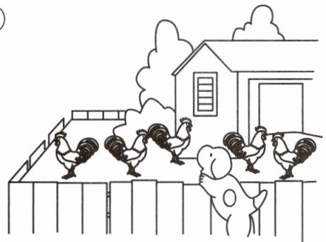 in the pond(池塘).(一)根据绘本内容,在图②至图⑤下方的横线上填写合适的数字单词。