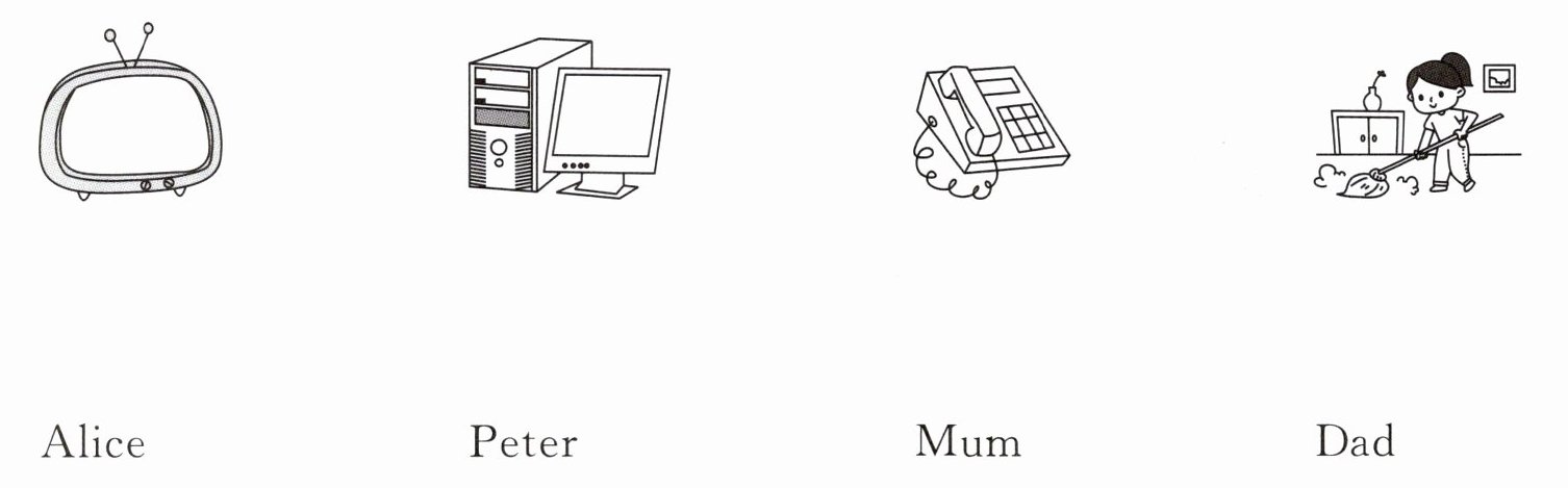 Alice lives in a city. It's warm(温暖的) the whole year(整年). Her favourite month is the fourth month of the year, because her mother's birthday is in it. It's Sunday today. Alice's family stay at home. Alice is playing on the computer. Her brother Peter is beside her. He is talking on the phone with his friend. Her dad is watching TV. Her mother is cleaning the room.