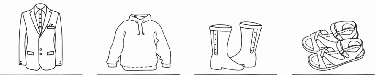 同学们,我们学习了许多衣服的英文表达方式,你知道下面几种衣物怎么用英语表达吗?请你通过向他人请教、查阅词典或书籍、借助媒体工具等方式,将它们的英文表达写在相应的四线三格上,并在方框中设计一套你喜欢的衣服吧!