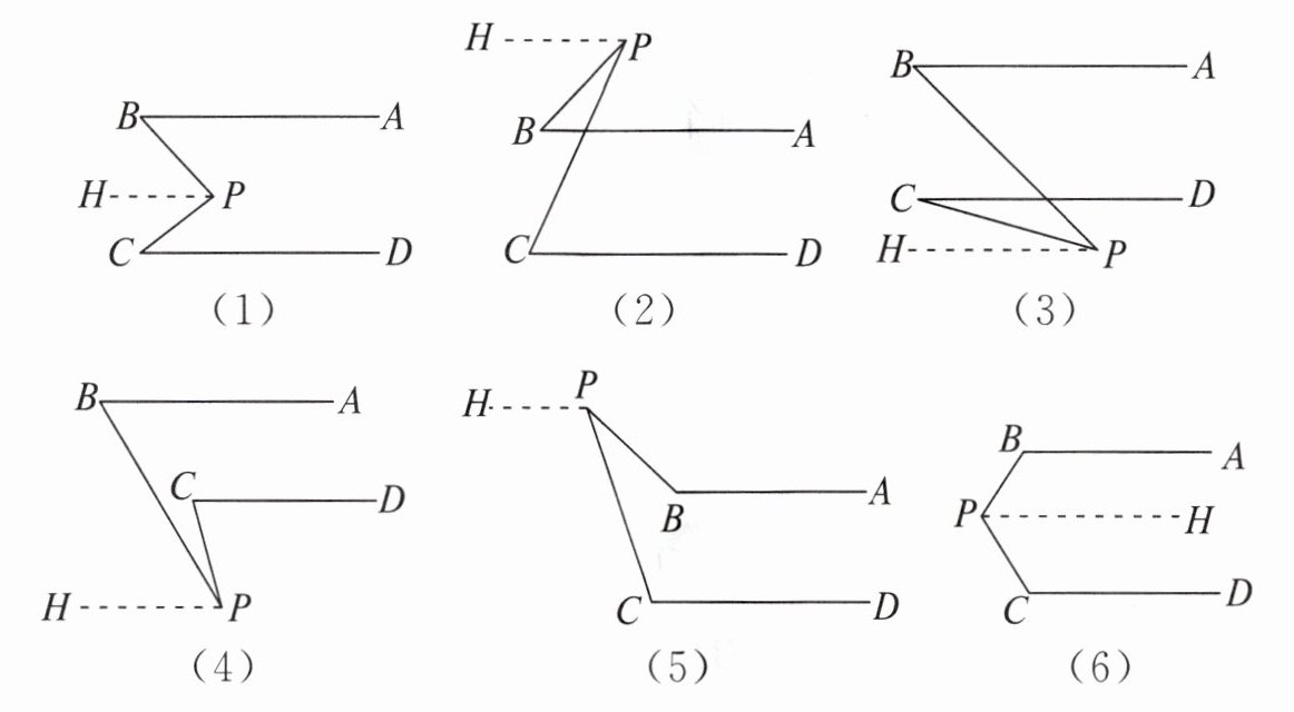 【典例剖析】如图,已知 $ AB // CD $。探究:$ \angle ABP $,$ \angle BPC $,$ \angle PCD $三者关系。