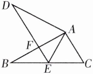 9. 如图,已知$\triangle ABC\cong \triangle ADE$,其中$AB$与$AD$,$AC$与$AE$是对应边,点$E$在边$BC$上,$AB$与$DE$交于点$F$。