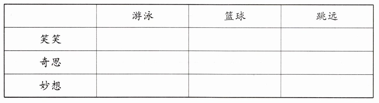 3. 笑笑、奇思和妙想各参加了一个体育兴趣小组,分别是游泳、篮球和跳远。妙想不喜欢游泳,奇思没有去过篮球队,笑笑是篮球队主力。你知道她们各参加了哪个小组吗?