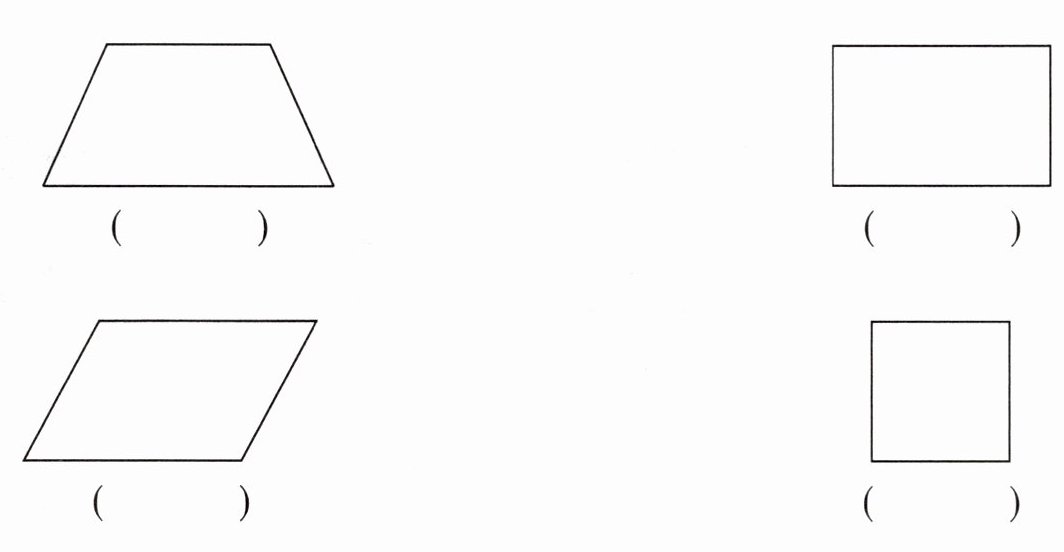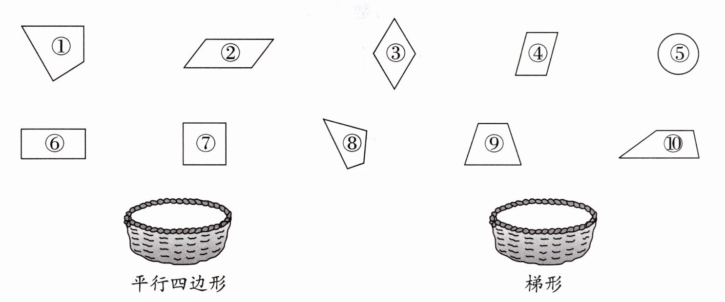 请你从图中找出平行四边形和梯形,并把它们放入对应的篮子里。