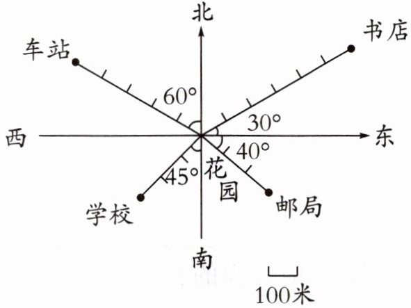 (2)公园在北偏东 30°,距离邮局 600 米。