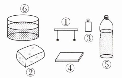 6. 为了探究压强的大小跟哪些因素有关,老师准备了如图所示的器材:①用钉子做腿的小桌;②海绵;③砝码;④木板;⑤盛有适量水的矿泉水瓶;⑥装有沙的容器等供同学们选择。同学们所选的四组器材中,不能达到探究目的的是 …………………………………………………(