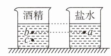 3. 如图所示,两个完全相同的烧杯中盛有等体积的酒精和盐水($ \rho_{盐水} > \rho_{酒精} $),下列关于这两种液体中 $ a $、$ b $、$ c $ 三点压强的说法,一定正确的是 …………………………………………………(