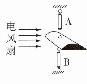 1. 某同学为了探究飞机的升力,制作了一个机翼模型,并把它穿在一根铁丝上,在铁丝的上下各挂一个弹簧测力计,他接通电风扇对着机翼吹风,如图所示。下面是该同学对实验结果做出的猜测,你认为正确的是 ……………………………………………………(