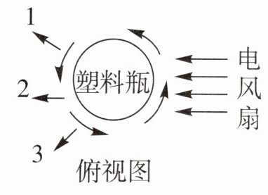 4. 用细线吊起一个空的塑料瓶,用手转动塑料瓶,使它绕对称轴线旋转,如图所示。若这时用电风扇向它吹风,它将移动,则移动方向是 ……………………………………………(