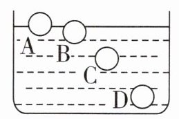 3. A、B、C、D 是四个体积、形状相同而材料不同的球,把它们放入水中静止后的情况如图所示,它们当中所受浮力最小的是 …………………………………………………(