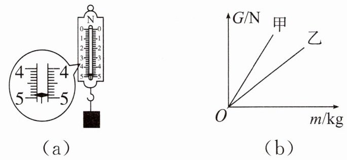 N。(5)小明对太空中的星球比较感兴趣,他从网上查得:甲、乙两个星球表面上物体的重力 $ G $ 与其质量 $ m $ 的关系如图(b)所示,从图中信息可知,相同质量的物体在甲星球表面上的重力