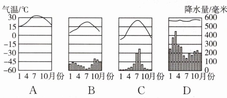 (2)在上图中用字母标注下列气候类型分布的位置。