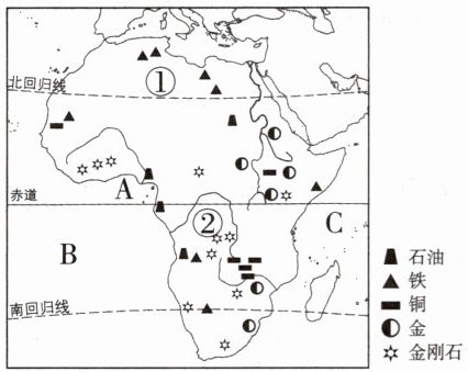 盆地。(2)非洲有丰富的矿产资源,请你列举两种: