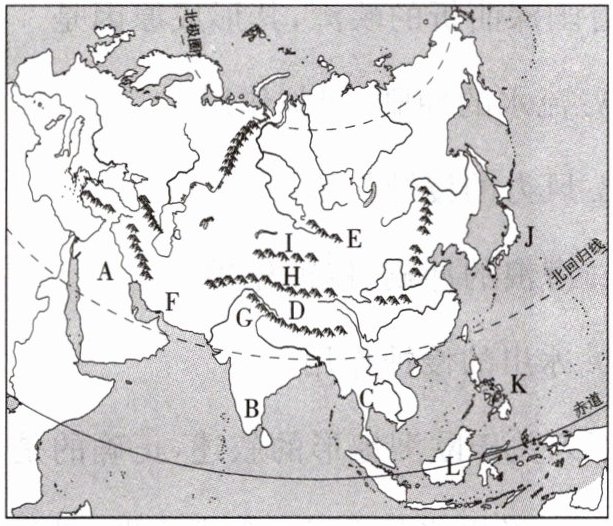 (1)阿拉伯半岛 印度半岛 中南半岛 青藏高原 蒙古高原 伊朗高原 昆仑山脉 天山山脉 喜马拉雅山脉 日本群岛 马来群岛